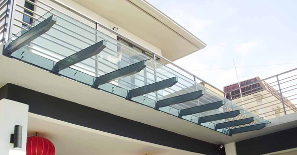 • Mái kính kết hợp với khung sắt và lan can kính.